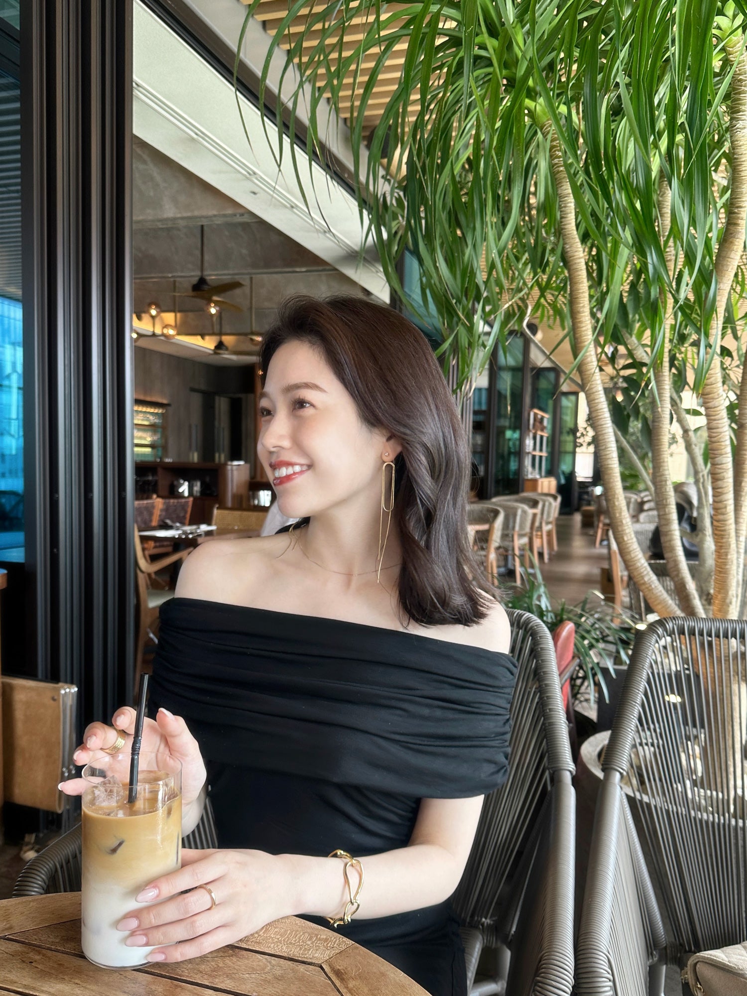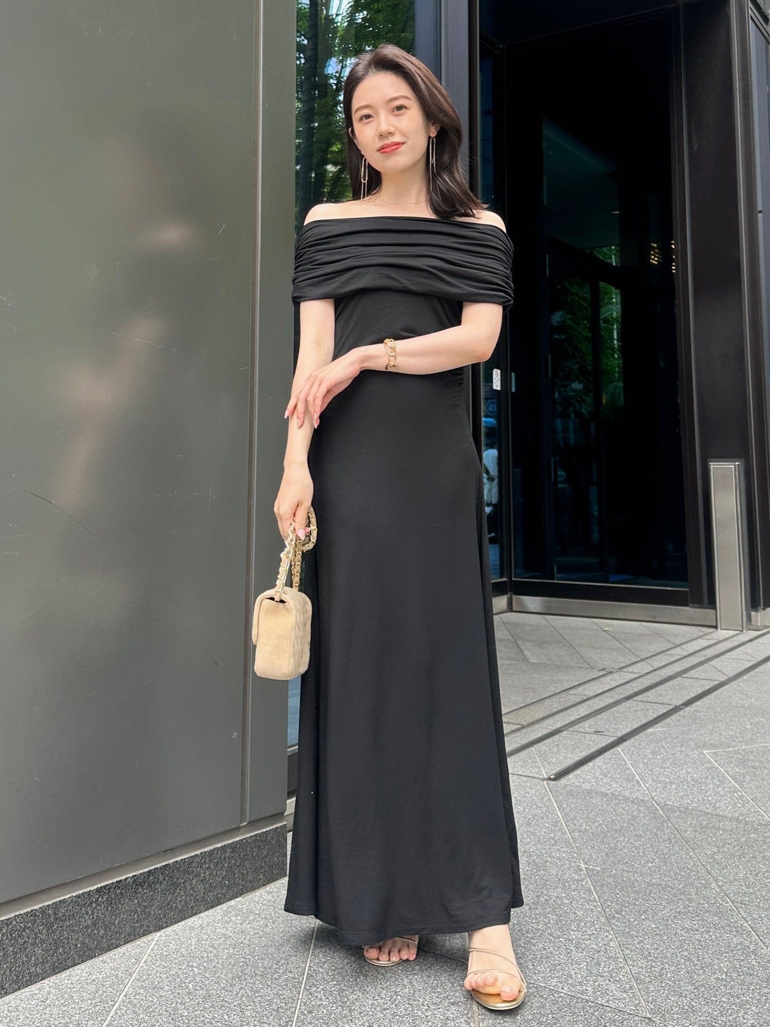 The theme is to spend an elegant time at the hotel wearing an Off shoulder gathered One piece.Take a break once in a while at a cafe and enjoy an elegant time.