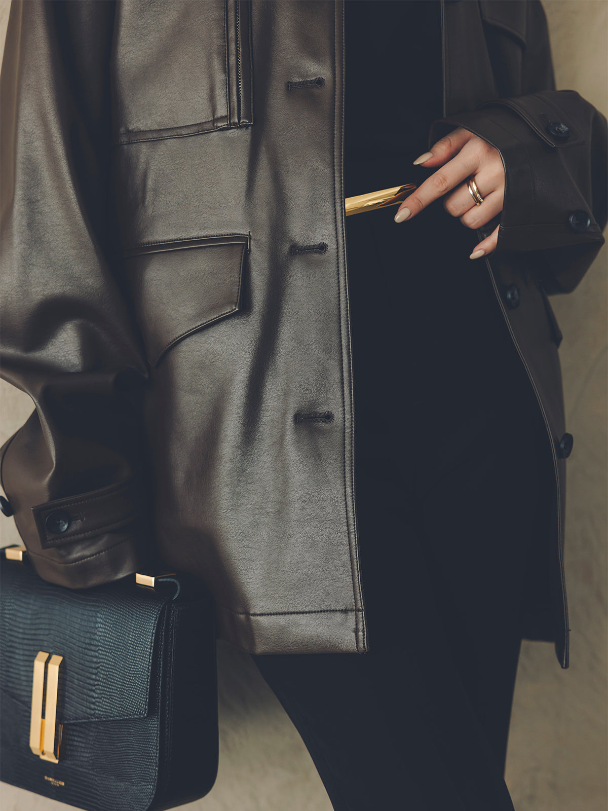 自然な光沢と深みのある絶妙なムラ感が、奥行きのある表情を生み出す表面感のヴィーガンレザーを使用しています。